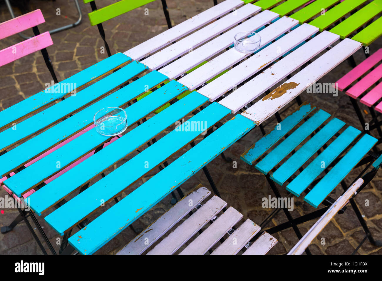 Old And Colorful Coffee Tables And Chairs Stock Photo 130692350
