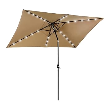 Edenbranch sun ray 811027 9x7 rectangular 8 rib solar patio umbrella 32 led lights crank and tilt aluminum frame taupebeige. The canvas is 180g polyester so will stand up to the elements. Easy crank operation with a tilt option.